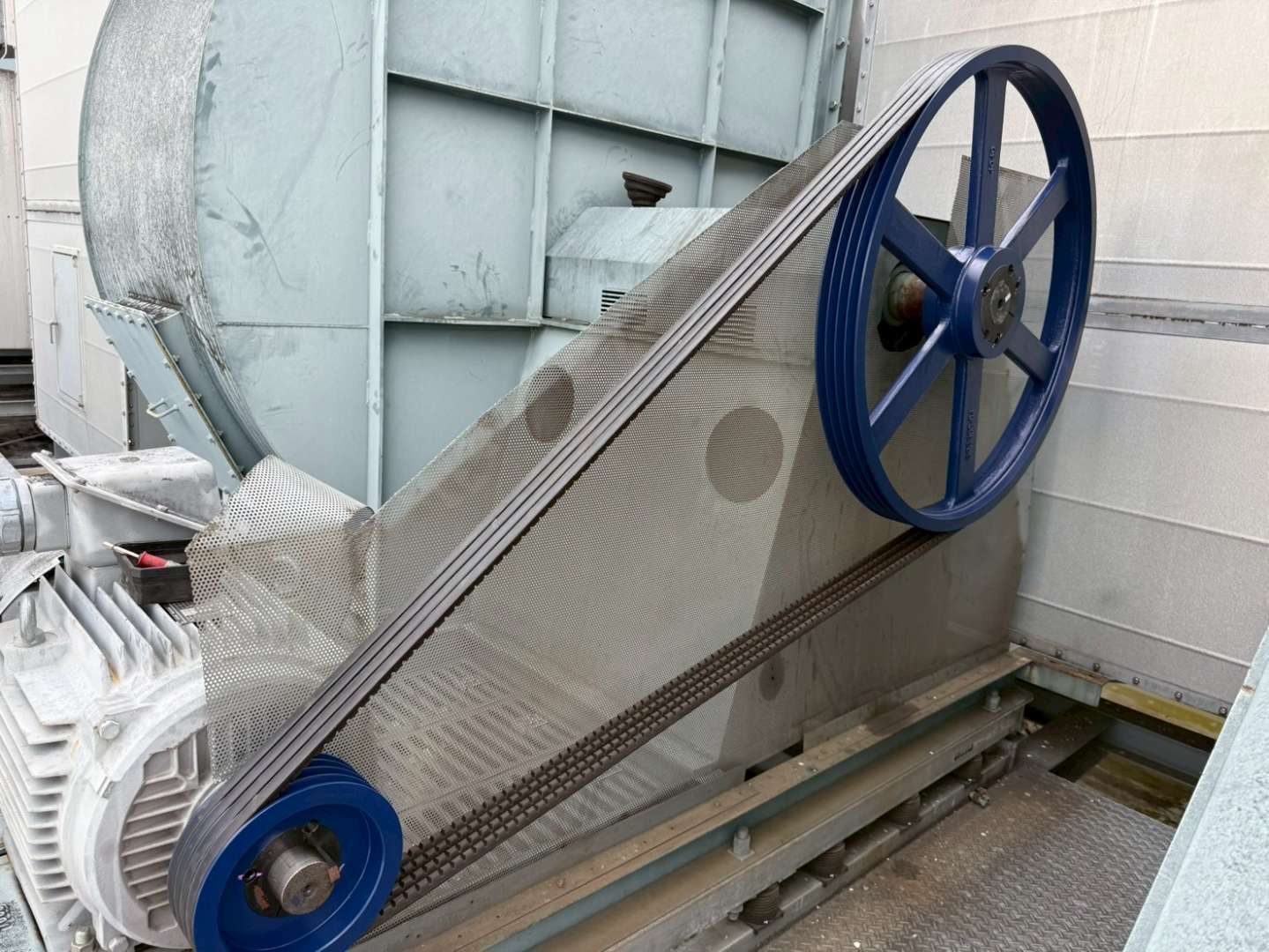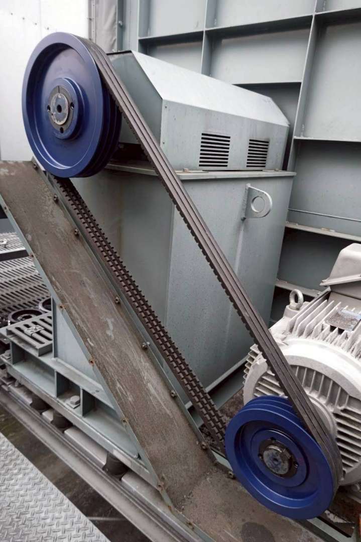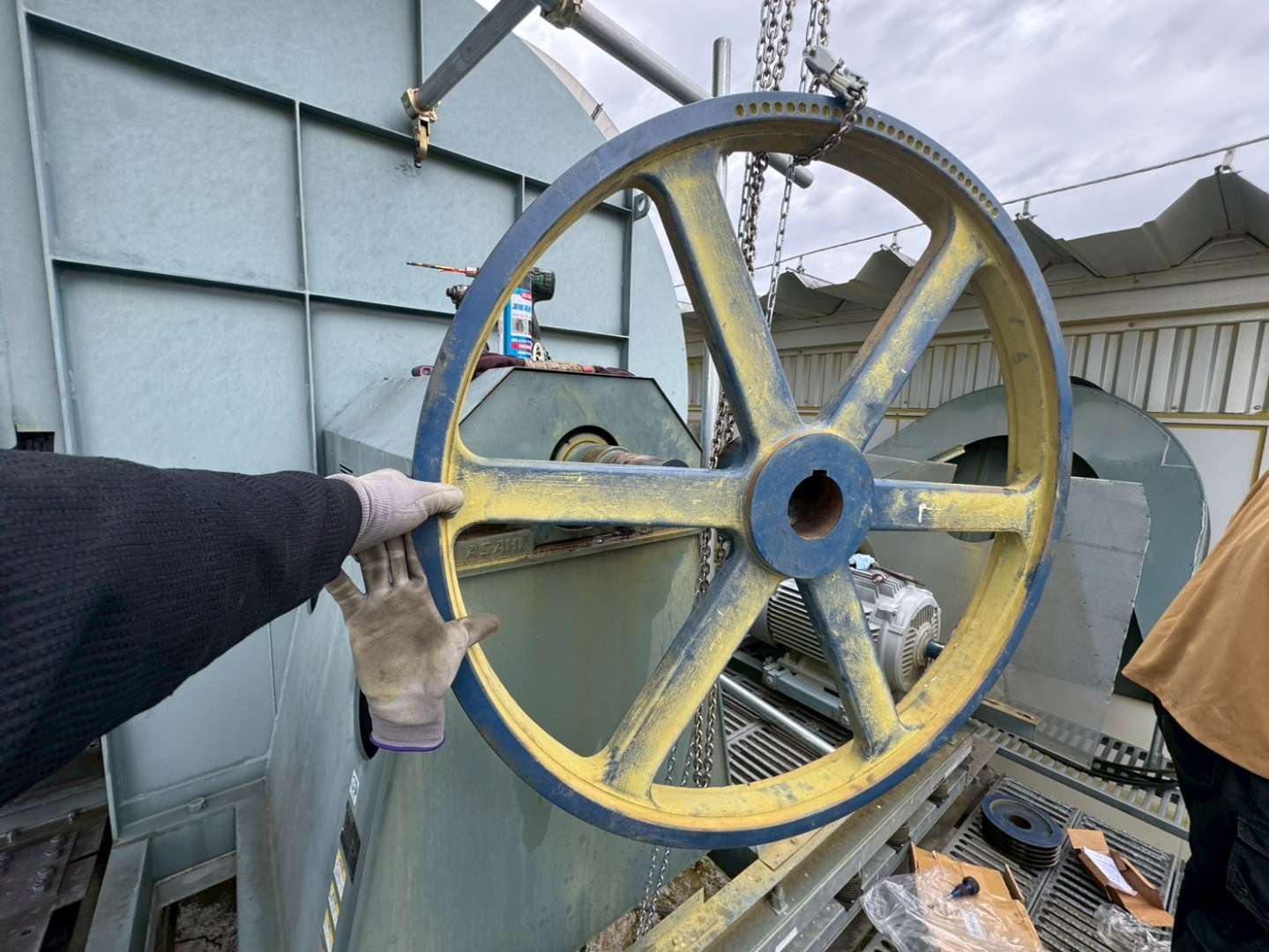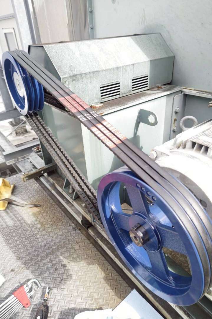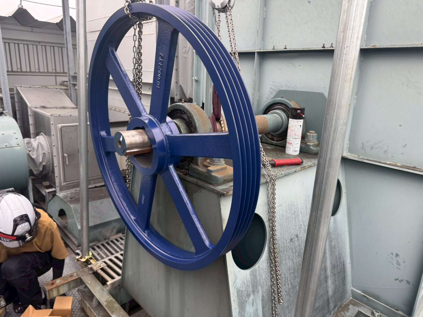 重量があるプーリー交換も安全に施工します。今回施工した中で一番大きいサイズでは100kgに迫るものもございましたが、架台を用いて適切に交換作業を行いました。